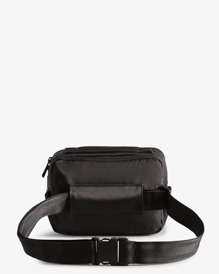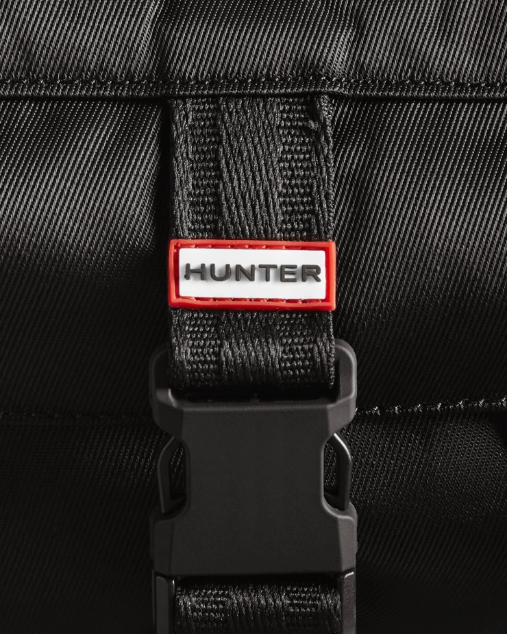 This multifunctional Crossbody is designed to be worn three ways ᄄC held by the top handle,across the body or around the waist. The black bag has a wide zip opening and gussets for easy access to the main compartment. It is made from a highly water-resistant,100% recycled nylon with a recycled polyester water-resistant jacquard lining.Certified vegan100% Recycled water-resistant nylon twill exterior100% Recycled polyester water-resistant lining for extra protectionCan be worn three waysAdjustable straps for ease of wearingInternal and external zip pockets for valuablesHunter PVC labelHeight 14cm,depth 10cm,width 21cm,strap length (when full extended) 130cm