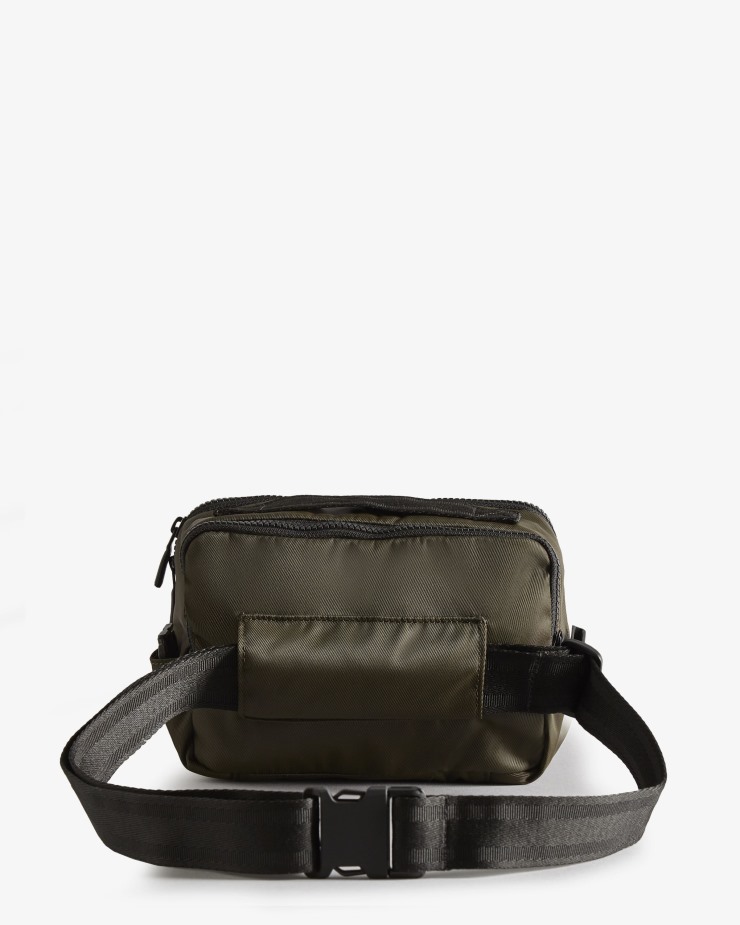 This multifunctional Crossbody is designed to be worn three ways ᄄC held by the top handle,across the body or around the waist. The olive green bag has a wide zip opening and gussets for easy access to the main compartment. It is made from a highly water-resistant,100% recycled nylon with a recycled polyester water-resistant jacquard lining.Certified vegan100% Recycled water-resistant nylon twill exterior100% Recycled polyester water-resistant lining for extra protectionCan be worn three waysAdjustable straps for ease of wearingInternal and external zip pockets for valuablesHunter PVC labelHeight 14cm,depth 10cm,width 21cm,strap length (when full extended) 130cm