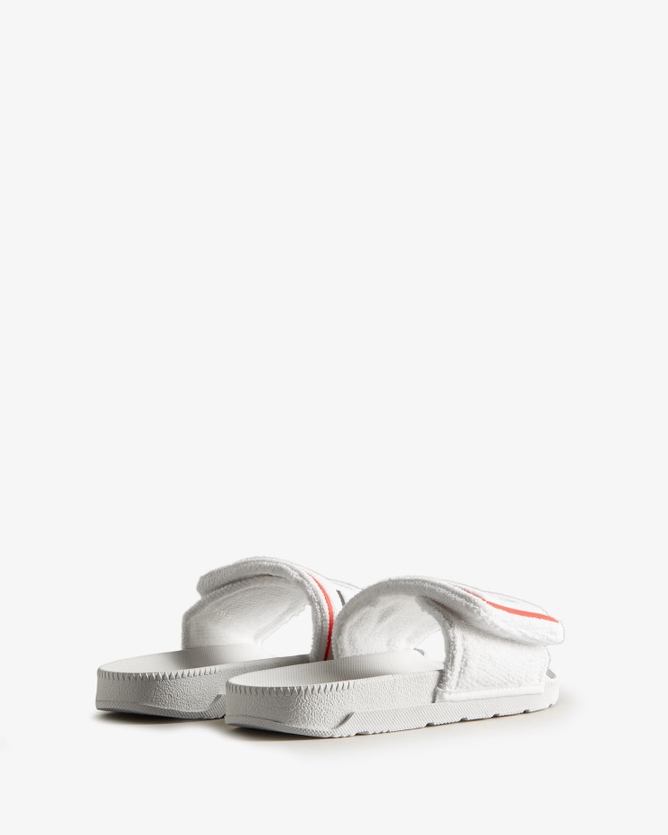 Size/Fit Summary: True to size,Regular fit with adjustability.The lightweight,Original Adjustable slides combine the softness or a beach towel with the comfort of a moulded footbed. Crafted from moisture-absorbing terry towelling,which eliminates irritation with every step,these white womens slides are fastened with a velcro strap stamped with the Hunter box logo for a customisable fit. Easy to clean and quick to dry,they are breathable,flexible and designed for long hot days by the pool.Terry towelling upper with Hunter box logoTowelling lining for comfortSoft and lightweight footbed for comfortMoulded EVA and rubber outsole with light contouringAdjustable velcro strapEasy to clean and quick to dry