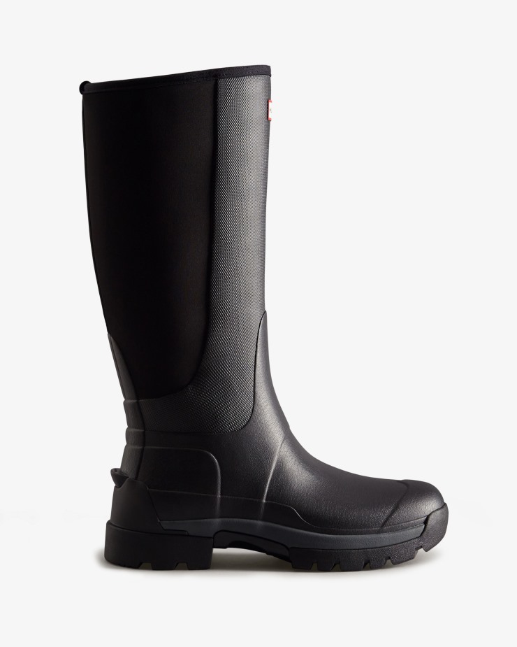 Size/Fit Summary: True to size,Regular fit.Note: The neoprene upper is not waterproof.Designed for city and country,the new Men's Balmoral Hybrid Tall Rain Boot bridges the divide between rural paths and urban parks. It delivers comfort,grip and weather protection across many terrains. First introduced in 1987,the Balmoral collection embodies Hunter's philosophy and heritage of pioneering design for those who require excellence in all weathers and landscapes. This new addition to the Balmoral collection has a 100% waterproof lower and handcrafted with a stylish,chunky,pull-on silhouette. The flexible Neoprene backing allows for ease of movement and comfort with every wear. This is coupled with a shock absorption sole and changeable 3mm and 5mm insoles. These black chunky rain boots are finished with a kick-spur for easy foot removal.We recommend that all Hunter boots be worn with socks to protect the wearer's skin from contact with rubber.Certified veganWaterproof lowerHandcraftedEngineered from natural rubber and insulating neopreneVibram? SolePull-on styleKick spur for ease of removalMulti-directional cleats