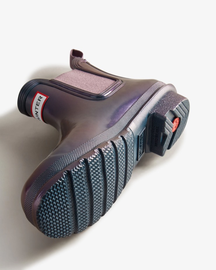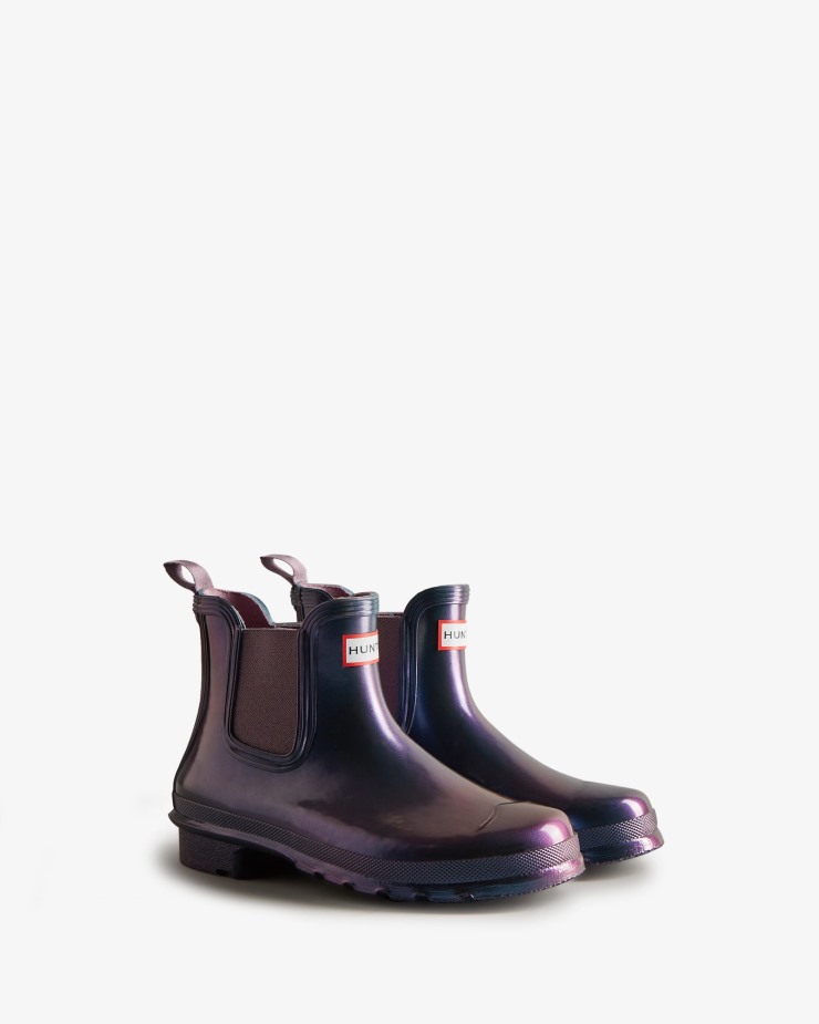 Size/Fit Summary: True to size,Regular fit with the addition of being slightly fitted around the foot. If you are in-between sizes,have a wider foot or want to wear a thick sock,it is recommended to size up.The Hunter Original Chelsea Boot has been re-engineered for an improved fit and all-day comfort. A wider ankle circumference,and an increased curve in the heel and around the Achilles tendon delivers an even more comfortable fit.Note: The base rubber color is blue however due to the unique iridescent finish,in some lights it may appear a different shade of purple/pink.The new Original Nebula Chelsea Boot is finished utilising a two-tone iridescent finish that shimmers through metallic shades as it moves in the light,and has an even more optimum fit to maximise all-day comfort. Ready for rain,each boot is handcrafted from natural rubber and vulcanised for superior protection. Retaining the iconic features of a traditional Chelsea,it features elasticated-gussets and has a nylon pull-tab to make stepping into the boot easy. Finished in a seasonal blue,these vibrant waterproof Chelsea's are a wet weather and festival wardrobe essential.We recommend that all Hunter Chelsea boots be worn with Hunter Chelsea socks,which have been technically designed to protect the wearer's skin from contact with rubber in specific areas.WaterproofHandcraftedPolyester liningRubber outsole with Hunter Original tread patternElastic side gussets and nylon pull-tabCrafted from natural vulcanised rubber with an iridescent finish