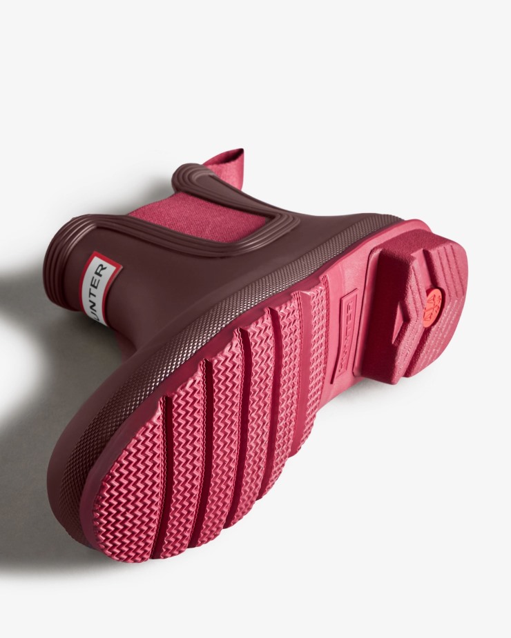 Size/Fit Summary: True to size,Regular fit with the addition of being slightly fitted around the foot. If you are in-between sizes,have a wider foot or want to wear a thick sock,it is recommended to size up.The Hunter Original Chelsea Boot has been re-engineered for an improved fit and all-day comfort. A wider ankle circumference,and an increased curve in the heel and around the Achilles tendon delivers an even more comfortable fit.The new and improved Hunter Original Chelsea Boot has an even more optimum fit to maximise all-day comfort. Ready for rain,each boot is handcrafted from natural rubber and vulcanised for superior protection. Retaining the iconic features of a traditional Chelsea,it features elasticated-gussets and has a nylon pull-tab to make stepping into the boot easy. Finished in a seasonal burgundy contrast combo,these waterproof Chelsea's are a wet weather wardrobe essential.We recommend that all Hunter Chelsea boots be worn with Hunter Chelsea socks,which have been technically designed to protect the wearer's skin from contact with rubber in specific areas.WaterproofHandcraftedPolyester liningRubber outsole with Hunter Original tread patternElastic side gussets and nylon pull-tabCrafted from natural vulcanised rubber with a matte finish