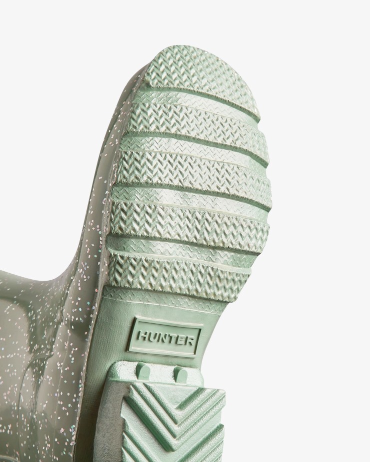 Size/Fit Summary: True to size,Regular fit. Sizing suitable for 5-11 year olds (size 13-5).Using a process unique to Hunter,this Big Kids Rain boot features a statement and chunky glitter finish over the iconic glossy base. A mini version of the iconic Original Tall Boot,this dusty green giant glitter kid's boot is crafted for little feet from vulcanised natural rubber that is highly resistant to wear and abrasion. With the added safety of reflective patches,Hunter Original tread and an updated 100% recycled polyester lining and insole,you can let your little pioneers take on new depths of exploration.We recommend that all Hunter boots be worn with socks to protect the wearer's skin from contact with rubber. All Hunter Boot Socks are specially designed for use with our kids boot range and feature a fold over top to cover the rubber and nylon boot edge,preventing any rubbing associated with wear.Certified veganWaterproofHandcraftedRecycled polyester lining and insoleRubber outsole with Hunter Original tread patternReflective patches for increased visibilityCrafted from natural vulcanised rubber with chunky glitter finish