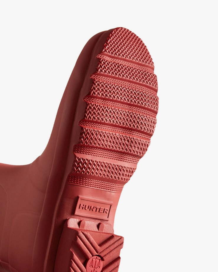 Size/Fit Summary: True to size,Regular fit.Perfect for wet weather conditions this women's Rain Boot Boot is a shorter version of the iconic Hunter Original Tall Boot. Formed of natural rubber,each boot is handcrafted and assembled over three days before being vulcanized for superior protection. Featuring the Hunter Original tread pattern,and a comfortable polyester lining,this red waterproof boot is a rainy-day necessity.We recommend that all Hunter boots be worn with socks to protect the wearer's skin from contact with rubber. All Hunter Boot Socks are specially designed for use with our boot range and feature a fold over top to cover the rubber and nylon boot edge,preventing any rubbing associated with wear.WaterproofHandcrafted from 28 partsPolyester liningRubber outsole with Hunter Original tread patternCrafted from natural vulcanised rubber with matte finish