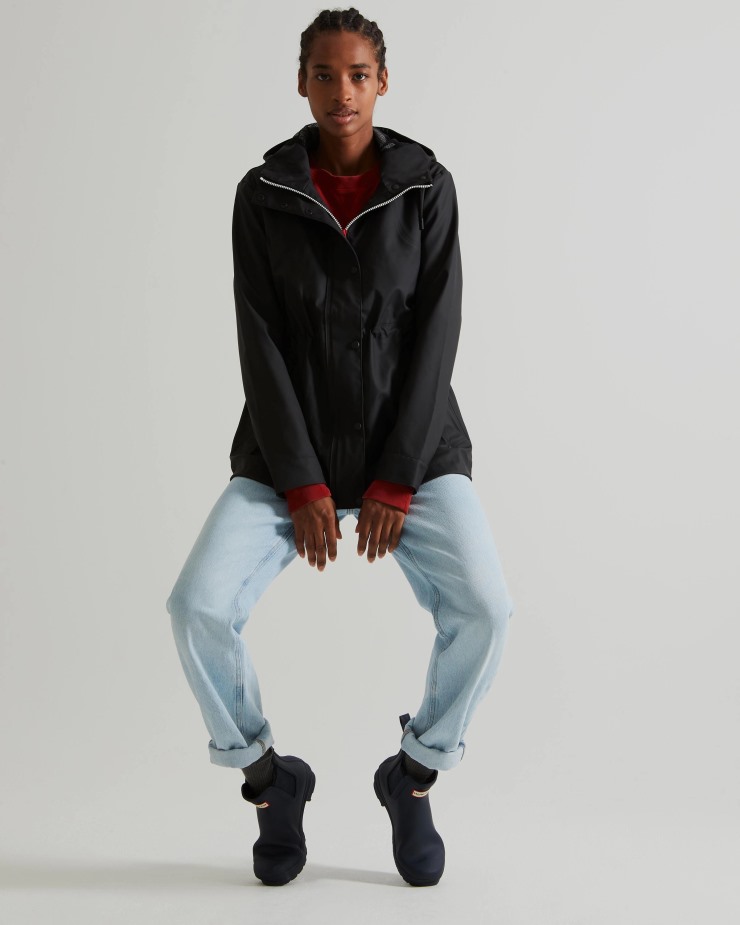 Size/Fit Summary: True to size,Regular fit. Centre back measurement for Size S is 70cm.Waterproof without the weight,get on-board with the updated lightweight rubber. A festival essential,this classic black fully waterproof jacket features a welded seam construction and storm flap closure for superior protection. An open back vent and full mesh body lining offer breathability,while the adjustable waist ensures a comfortable fit.Certified veganFully waterproof with welded seamsHunter Tri-coloured zipper with snap storm flapFull body mesh lining for breathablilityUnderarm eyelets and open back vent for additional ventiliationHood with drawcord to adjust opening to protect from wind and rainDraw cord at waist to adjust fitReversed entry welt pockets to prevent rain from enteringSnap adjustable cuff