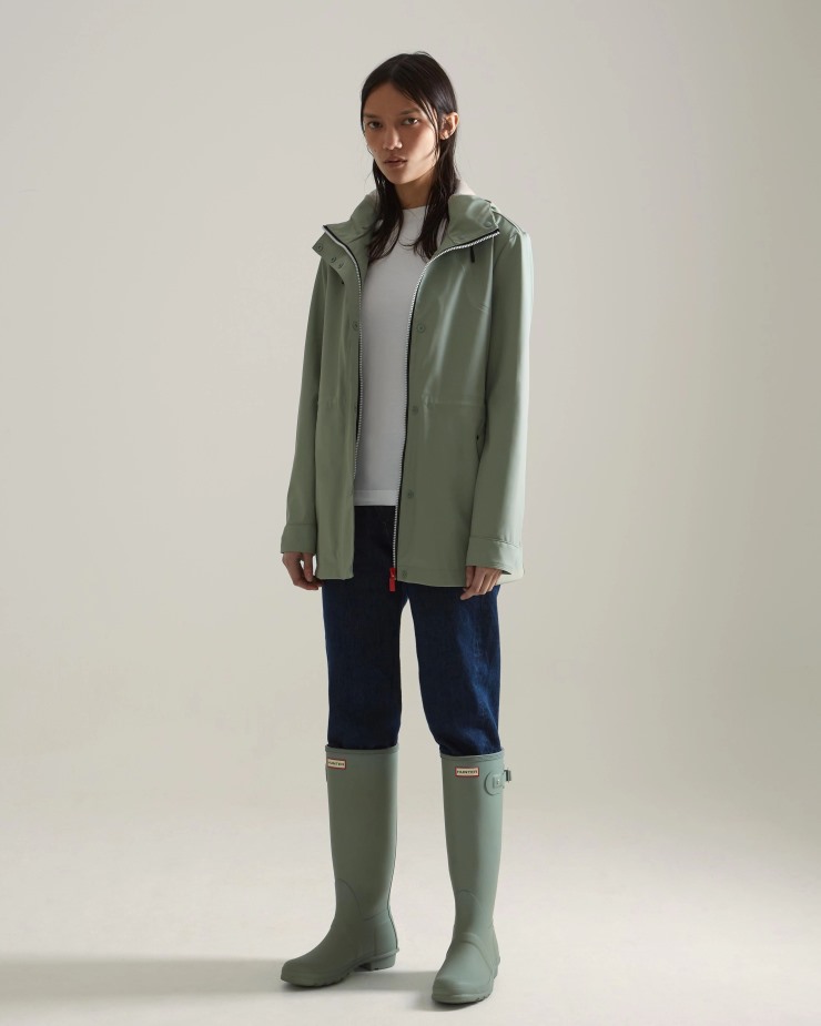 Size/Fit Summary: True to size,Regular fit. Centre back measurement for Size S is 70cm.Waterproof without the weight,get on-board with the updated lightweight rubber. A festival essential,this seasonal green fully waterproof jacket features a welded seam construction and storm flap closure for superior protection. An open back vent and full mesh body lining offer breathability,while the adjustable waist ensures a comfortable fit.Certified veganFully waterproof with welded seamsHunter Tri-coloured zipper with snap storm flapFull body mesh lining for breathablilityUnderarm eyelets and open back vent for additional ventiliationHood with drawcord to adjust opening to protect from wind and rainDraw cord at waist to adjust fitReversed entry welt pockets to prevent rain from enteringSnap adjustable cuff