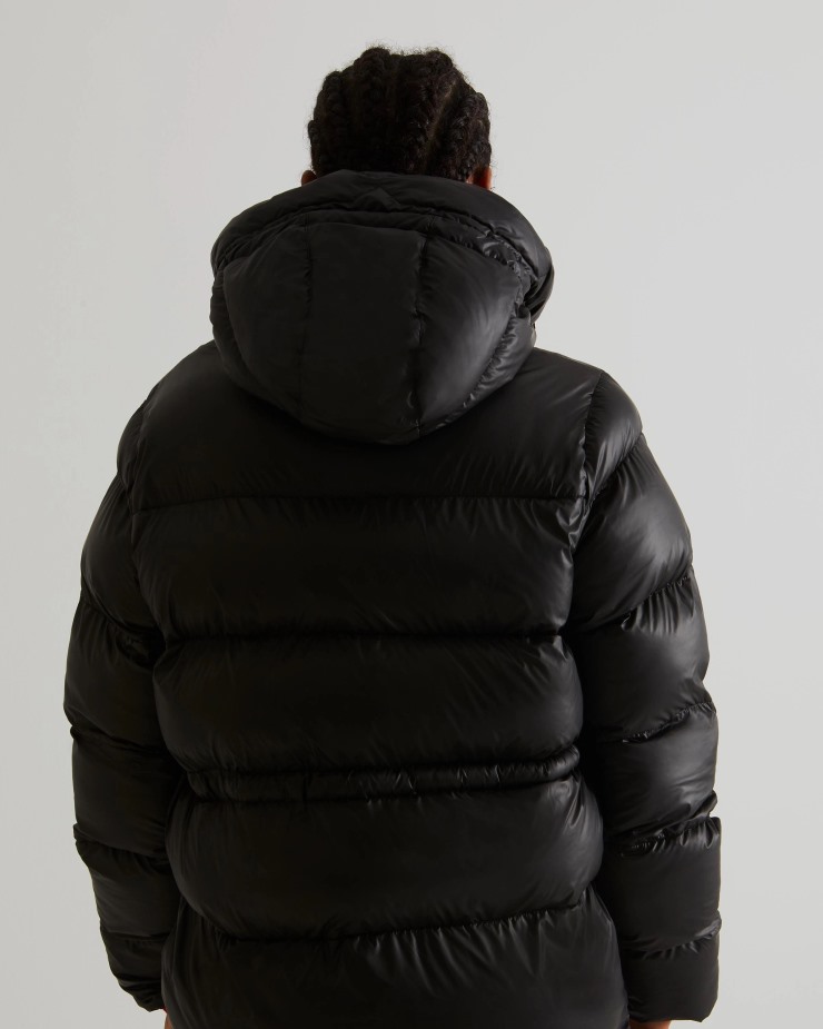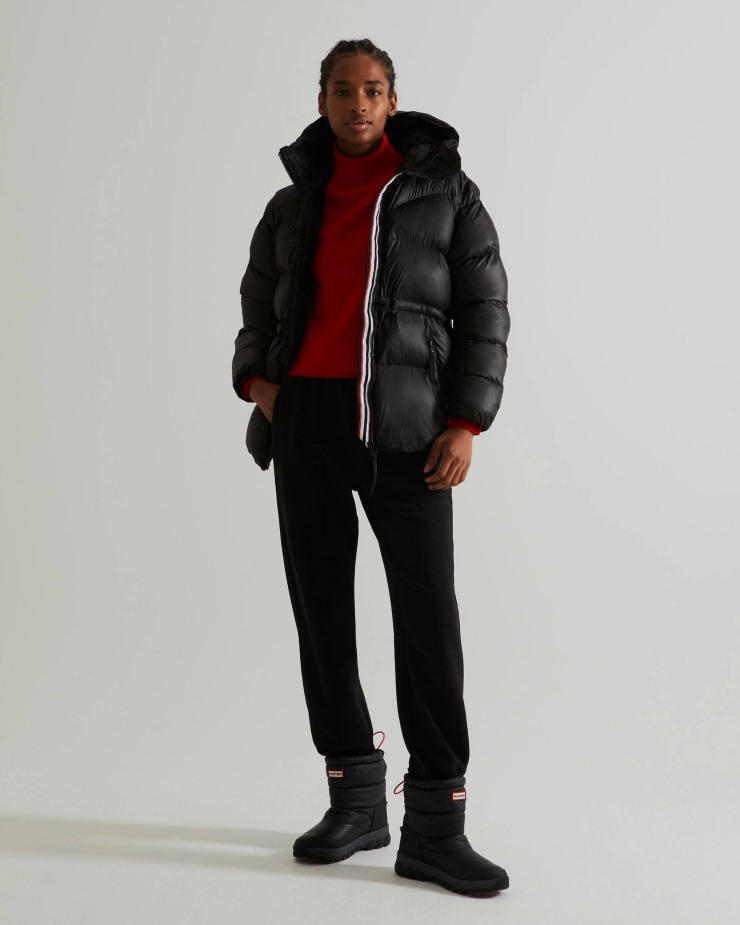Size/Fit Summary: True to size,Regular fit. Slimmer fit on arms. Model is 176cm / 5' 9?" and is wearing a size S. Centre back measurement for Size S is 25.1" (64cm) and sleeve length from shoulder point is 24.8" (63cm).Note: This Puffer Jacket has been fully padded for optimum warmth,so it may retain a stiffer shape on some figures.We've made two tweaks to our bestselling vegan Women's Rubberized A-Line Puffer Jacket to make it even more sustainable. The soft,padded insulation is made from upcycled recycled plastic bottles and the lining is crafted from recycled polyester. With a water-repellent rubberized shell,this black jacket will keep you warm in temperatures as low as -25��C (-13��F).Certified veganWater-resistantShell fabric has a light polyurethane coating for a rubber touch feelHighly insulated using eco-friendly filling made from recycled plastic bottlesFleece lined hood for added warmthFront zip pockets with knuckle side liners for added warmthCentre front Hunter branded zipInternal chest pocket with zip closureConcealed elasticated gaiter on cuffs for added warmthBungee drawcords at waist and hood for adjustabilityCan be worn in temperatures as low as -25��C (-13��F)