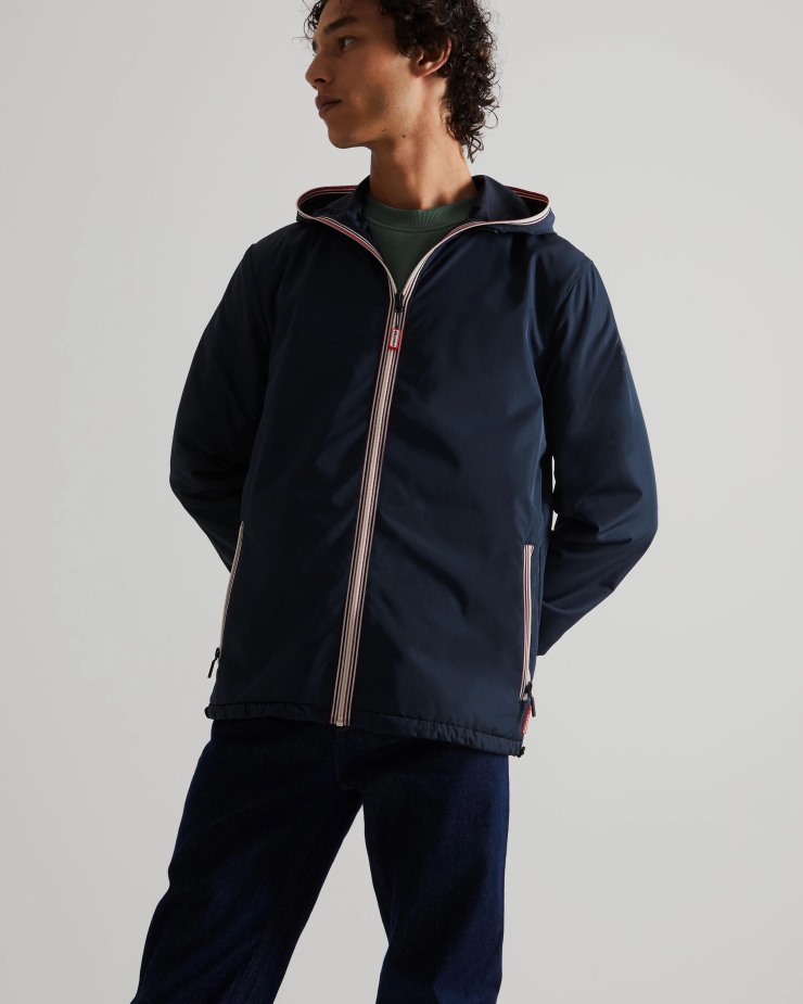 Size/Fit Summary: True to size,Regular fit. Centre back measurement for Size M is 70cm/27.5".The Original Shell jacket in a classic navy is packable,water-resistant and lightweight. Zip-up,stand out and be protected from the wind and rain with this windbreaker style jacket that's crafted from 100% recycled polyester with a carbon-free coating. Underarm eyelets offer breathability while the adjustable hem and hood provide extra protection from the elements. When the sun comes out,simply pack it away into the small bag tucked away in the neck seam.Water-resistant using a carbon-free coatingStows away into attached bag at the neck seamHood with draw cord adjuster for extra wind and rain protectionAdjustable hem with drawcordUnderarm eyelets for ventilationElasticated cuffHunter signature zips