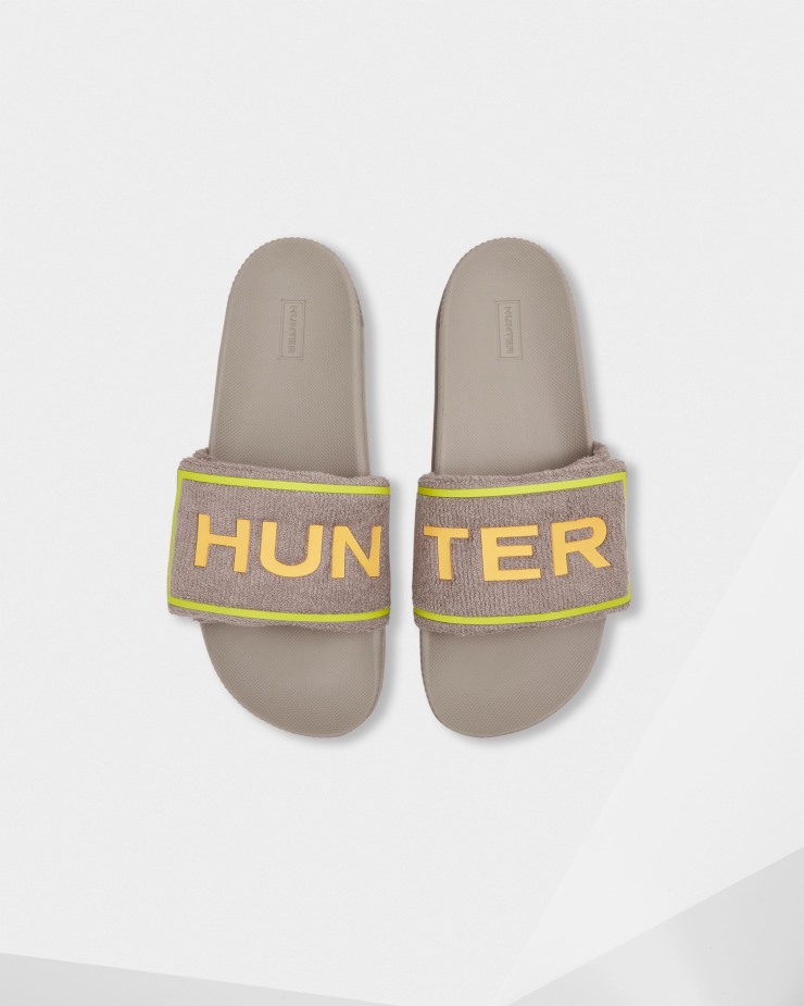 Size/Fit Summary: True to size,Regular fit with adjustability.The lightweight,Original Adjustable slides combine the softness or a beach towel with the comfort of a moulded footbed. Crafted from moisture-absorbing terry towelling,which eliminates irritation with every step,these grey and green mens slides are fastened with a velcro strap stamped with the Hunter box logo for a customisable fit. Easy to clean and quick to dry,they are breathable,flexible and designed for long hot days by the pool.Terry towelling upper with Hunter box logoTowelling lining for comfortSoft and lightweight footbed for comfortMoulded EVA and rubber outsole with light contouringAdjustable velcro strapEasy to clean and quick to dry