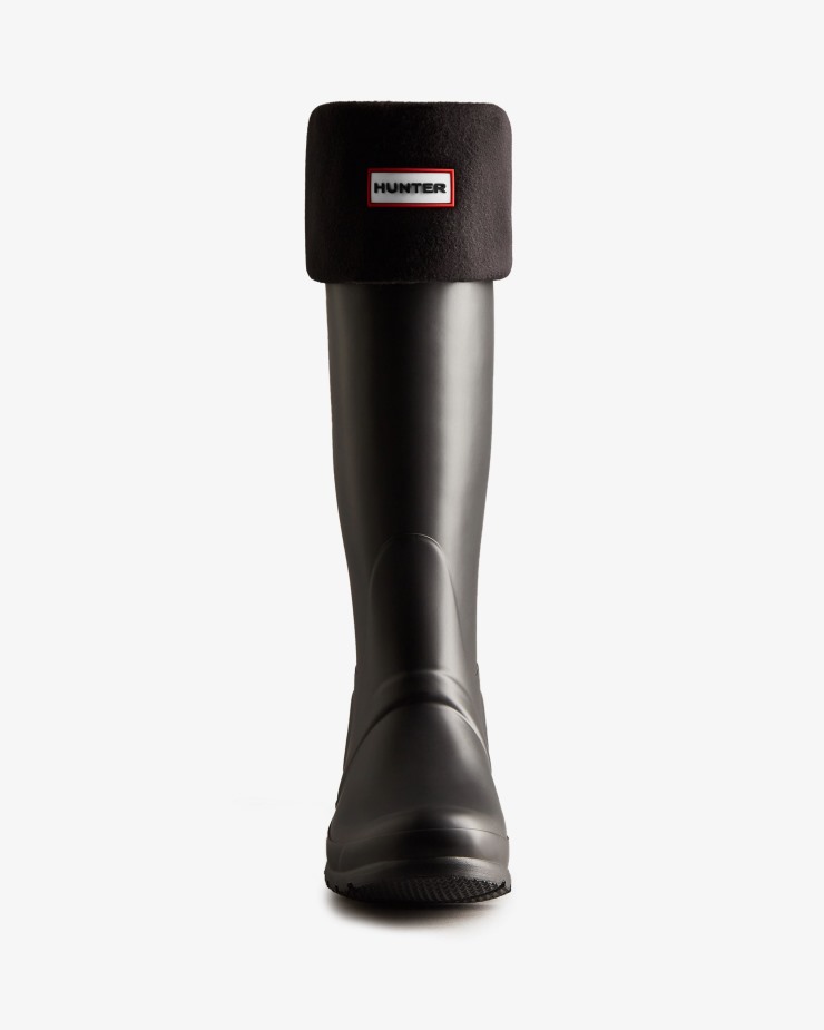 Size/Fit Summary: Sizes run slightly large ᄄC we recommend the following sizing for wearing with your Original Tall Hunter Boots. Size M = US Women's Size 5-8. Size L = US Women's Size 9-11,US Men's Size 8-10. Size XL = US Men's Size 11-13.Ready to be slipped inside our wide-fit Tall Rain Boots for added insulation,these black Recycled Socks are made from 100% sustainable polyester that's upcycled from post-consumer waste. Now with a new improved fit,these fleece socks have a cuff that will fold over the top of our rain boots.Certified vegan100% Recycled polyester fleece leg for warmth100% Recycled polyester fold down cuffDesigned to fit the Tall Wide Rain bootPVC logo brandingUpdated improved fit for added comfort