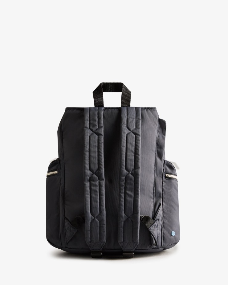 The Hunter Original Nylon Top Clip is weatherproof and perfect for daily commutes and weekends away. Crafted from water-resistant nylon with a leather trim,it has a spacious interior with a 16L capacity. For extra security,it's fitted with a parachute clip and zip closure at the top. A padded back pocket provides storage for a 13.5" laptop while the side pockets offer easy access to everyday necessities. This backpack is inspired by our iconic Original Tall Rain boot with elements like the Hunter Tri-colored zips and padded adjustable straps,which feature our signature quilting,integrated into the design. In a classic navy,it is undeniably distinctive and true to Hunter's DNA.Water-resistant nylon twill exteriorWater-resistant jacquard lining for extra protection of belongingsPadded adjustable back straps for increased comfortSignature Hunter box logo and Tri-colored zipsProtective back padded pocket suitable to hold a 13.5" laptopAvailable in a smaller sizeHeight (when clipped close) 37cm,depth 11.5cm,width (not including pockets) 27cm,capacity 16L