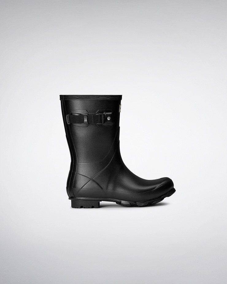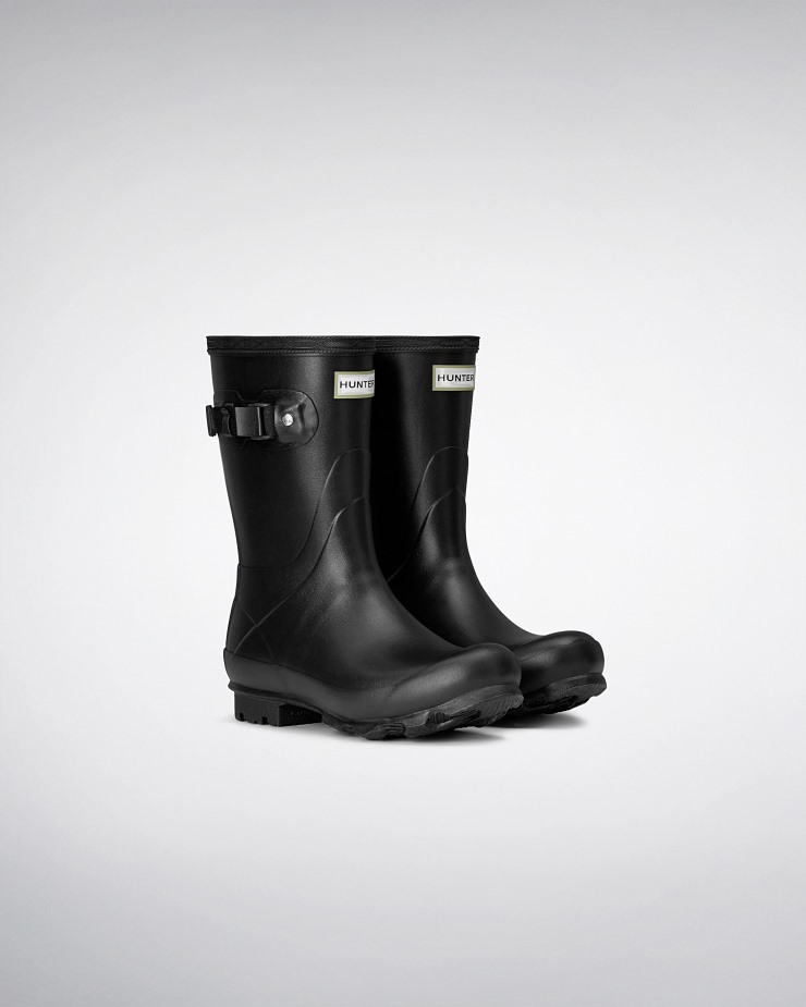 Size/Fit Summary: True to size,Regular fit.Named after Hunter's founder,Henry Lee Norris,this Women's Short Rain boot is built for sustained use on varied terrain. Handrafted from a soft rubber compound,the product is strong yet flexible. In a classic black,this boot fuses the unique design style of the iconic Original Short with new technical developments for added resilience. A reinforced panel has been introduced to increase structure and support,while a newly designed,robust Field outsole with zigzag tread ensures grip and mud-release.We recommend that all Hunter boots be worn with socks to protect the wearer's skin from contact with rubber.WaterproofHandcraftedPolyester liningWeather resistant buckle and strap holderHunter branded hardwareWebbing strapSturdy soleSemi-matte finishThis is a performance style with high durability