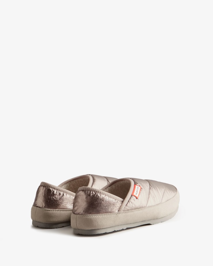 Size/Fit Summary: True to size. Regular fit.With a sole crafted from a lightweight and flexible EVA compound,our Women's Metallic Puffer Slippers can withstand wear both around the home and outside. Prioritising comfort,these metallic slippers have a fold-down heel,and are crafted with an added thermal insulating insole and microfibre fleece lining to help wick away moisture.Certified veganHandcraftedLightweightMetallic nylon upperThermal insole for added insulationEasy to clean and quick to dryVegan Shearling fleece lining for warmth and helps wick away moistureFoldable upper for ease of foot entry